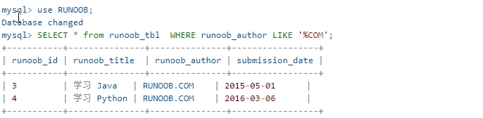 但是有时候我们需要获取 runoob_author 字段含有 “COM” 字符的所有记录,这时我们就需要在 WHERE 子句中使用 SQL LIKE 子句。