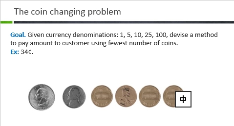 每一次都选择小于等于所找面额中的最大硬币值:` bash