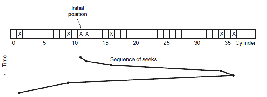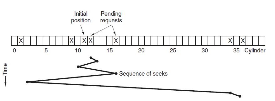 虽然平均寻道时间比较低,但是不够公平。如果新到达的磁道请求总是比一个在等待的磁道请求近,那么在等待的磁道请求会一直等待下去,也就是出现饥饿现象。具体来说,两边的磁道请求更容易出现饥饿现象。