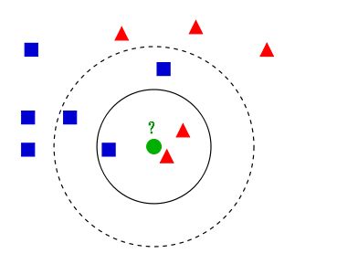 如果K=3,绿色圆点的最邻近的3个点是2个红色小三角形和1个蓝色小正方形,少数从属于多数,基于统计的方法,判定绿色的这个待分类点属于红色的三角形一类。