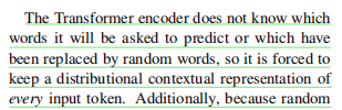 Transformer编码器不知道它将被要求预测哪些单词,或者哪些已经被随机单词替换,因此它必须对每个输入词保持分布式的上下文表示???