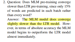 因为BERT模型在每一次训练过程中只对当前batch中的15%的词进行预测(因为每次随机遮住15%的词),而LTR模型在训练的时候每一次都会对每一次进行训练。所以用MLM的话,收敛速度会比LTR慢。直观上也可以理解,假设一个sequence有100个token,那么在BERT模型的MLM任务中,每次只有随机15个单词被预测,所以需要多训练几次,这儿样随机到的词就更多,更有利于上下文的表达。另外预测这15个词的过程也会有时间上的开销,所以收敛会慢一点。