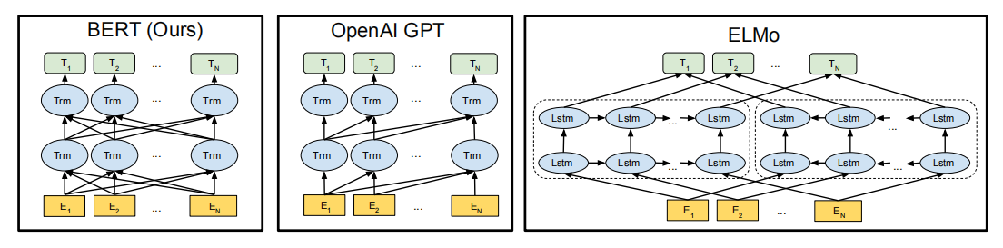 图1:预训练模型架构的差异。BERT使用双向Transformer。OpenAI GPT使用从左到右的Transformer。ELMo使用经过独立训练的从左到右和从右到左LSTM的串联来生成下游任务的特征。三个模型中,只有BERT表示在所有层中共同依赖于左右上下文。
